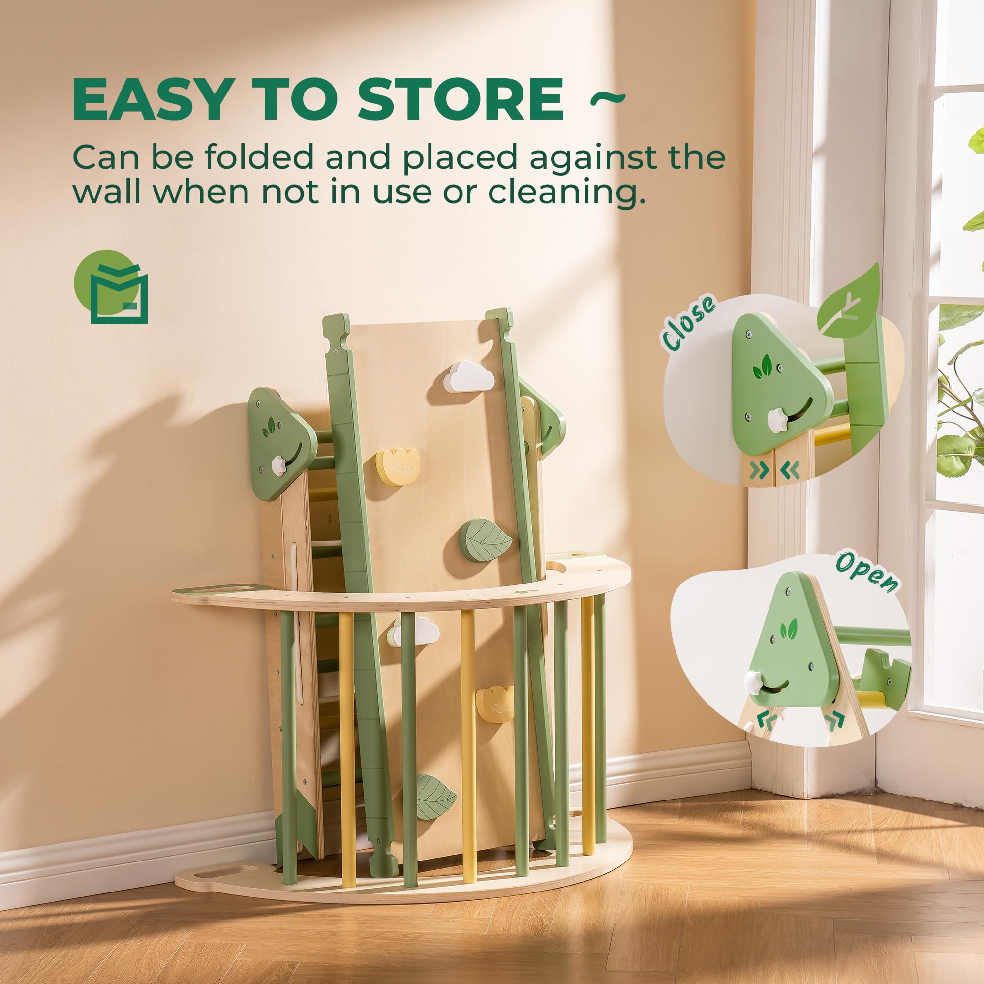 - Multifunctional 5 in 1 Climbing Set: Pikler triangle, slide, ladder, ramp, and arch that flips to a rocker.