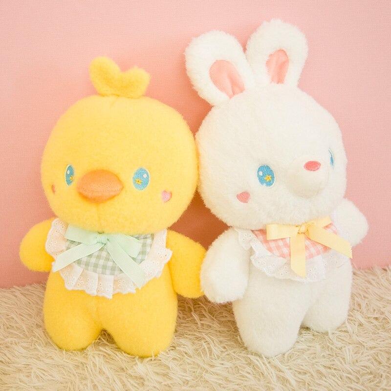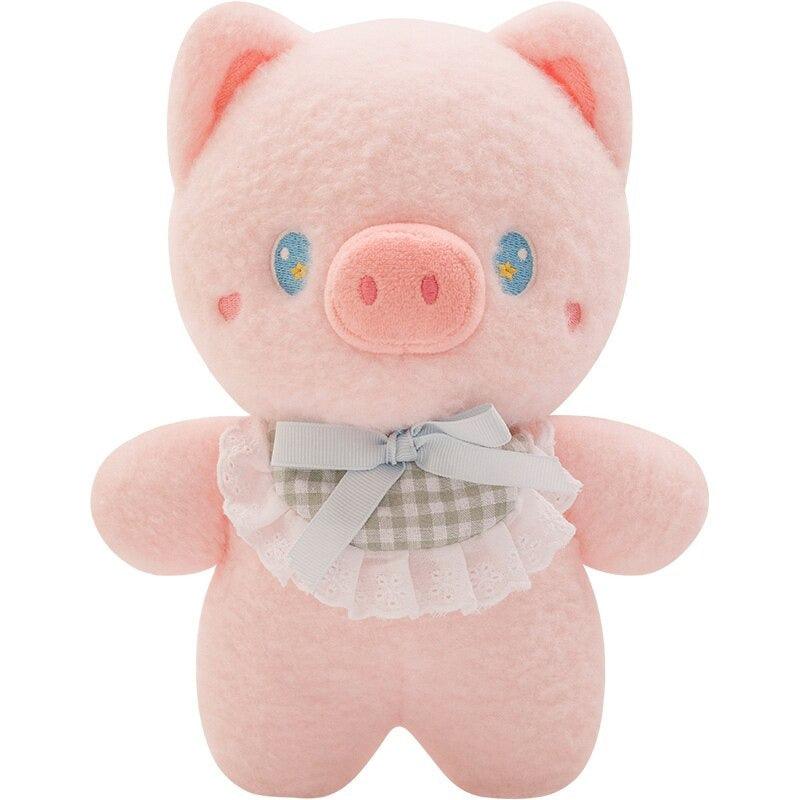The plush features an integrated gingham-style bow and collar with lace frill detail, adding structure to the neck area and enhancing visual character without using detachable accessories.