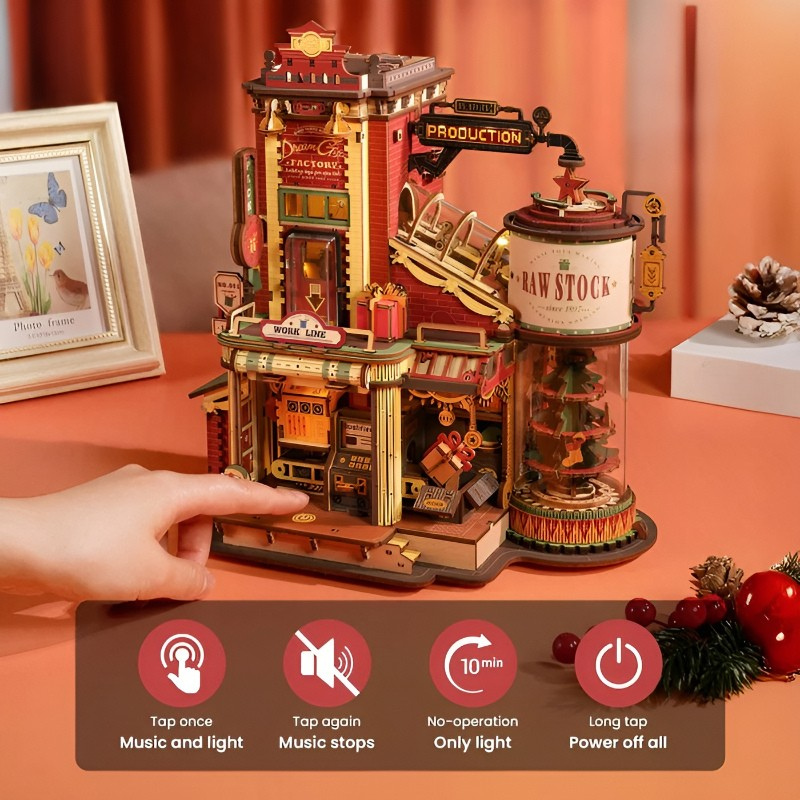 - One-Touch Control System: A front button controls lights, music, and factory movements with simple taps.