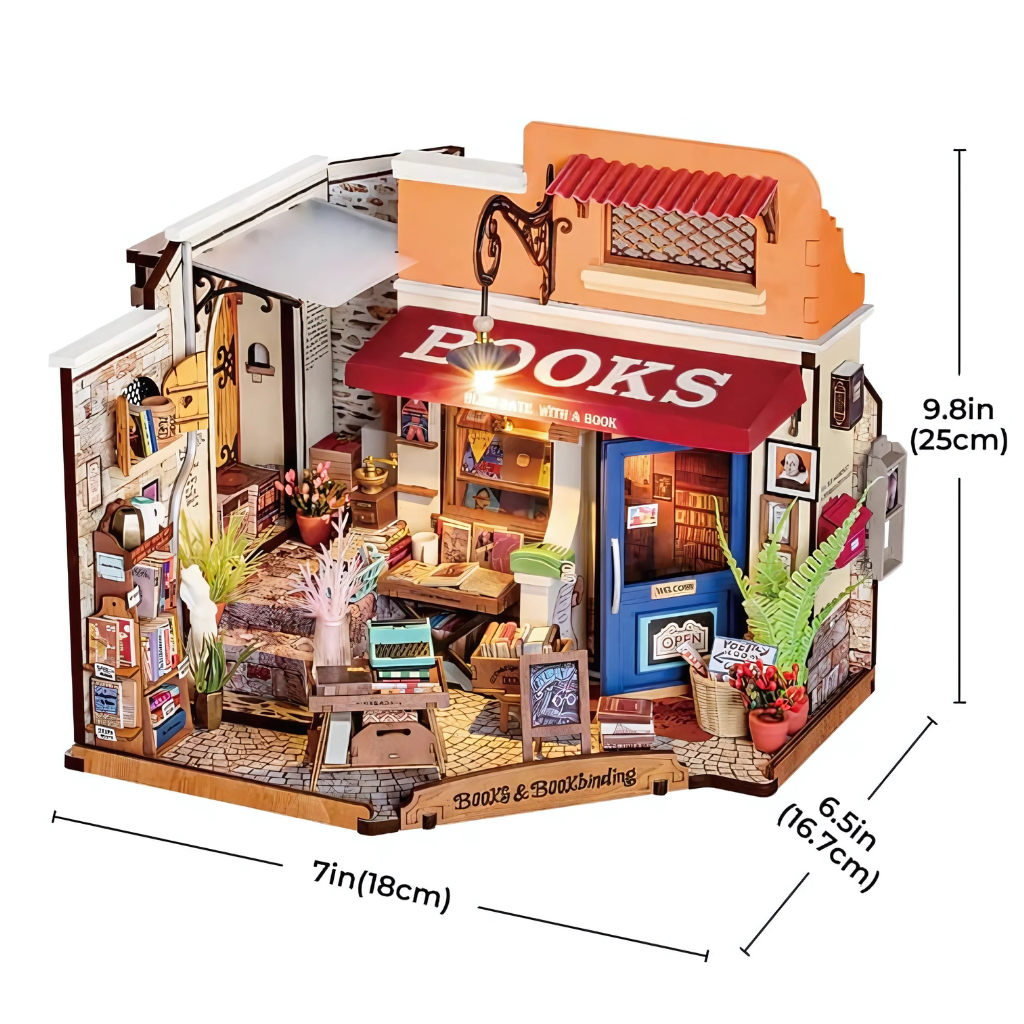 The Corner Bookstore DIY Kit delivers a creative experience and a beautiful final result. Its precision-cut wooden pieces, open-layout design, LED feature, and miniature props combine to form an immersive craft project.