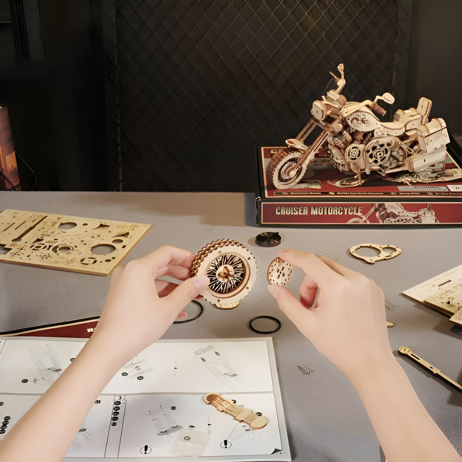 The Cruiser Motorcycle Wooden Puzzle is a DIY 3D wooden model kit that recreates the rugged design of a heavy-duty cruiser bike. Inspired by the open roads and the thrill of classic motorcycles, this model combines mechanical ingenuity with precision woodcraft. With 420 laser-cut wooden pieces, it offers builders an immersive assembly experience that results in a striking, spring-powered model motorcycle.