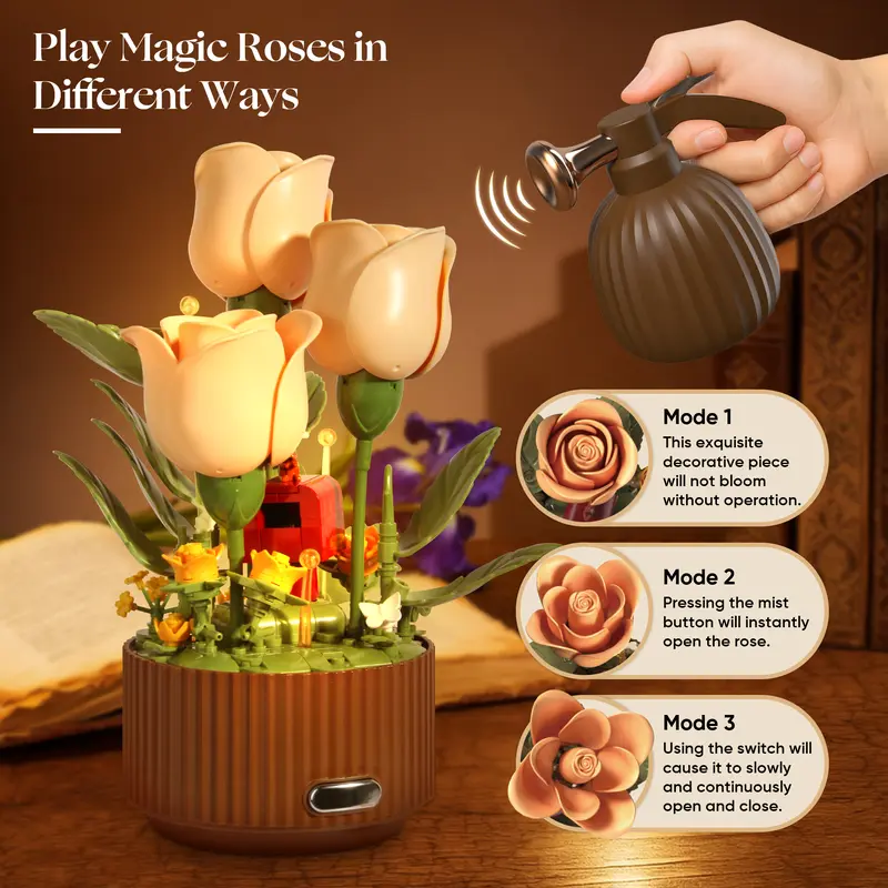 The DIY Blooming Rose Building Block Set With Lights For Decor stands out by blending visual beauty with interactive mechanics. The blooming motion adds life to the finished build, while the integrated lighting enhances its decorative appeal day or night. The watering can remote offers an engaging way to activate movement, making the display feel dynamic rather than static. Once assembled, it functions as an elegant décor piece that fits seamlessly into bedrooms, offices, or shelves. This set is ideal for those who enjoy hands-on creativity and decorative results in one complete experience.