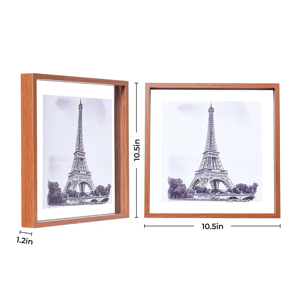 The Floating Glass Frame provides a layered effect where the image seems suspended within the display. It accommodates prints, photos, or artwork of varying dimensions, allowing creative arrangement.