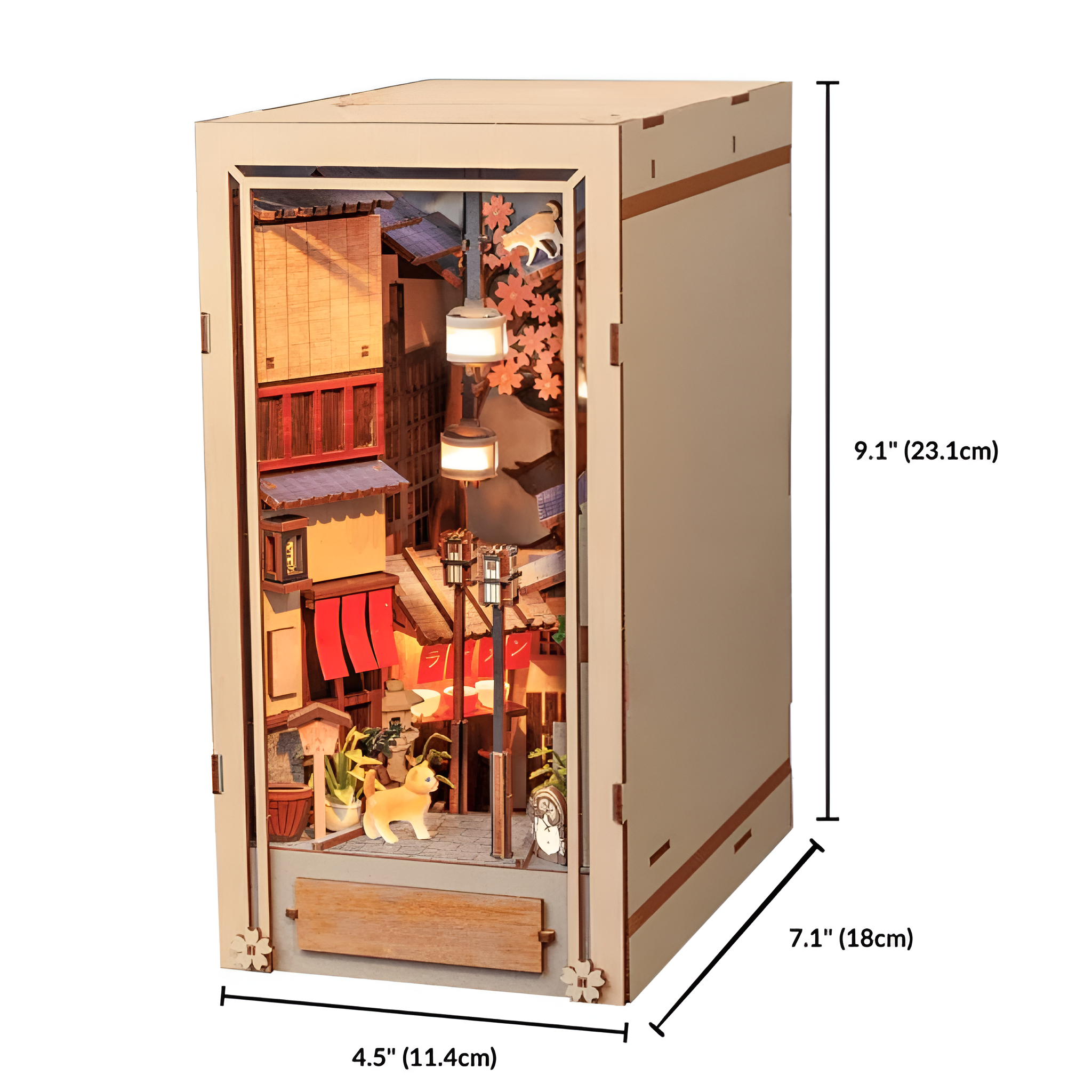 The Kyoto Gion Book Nook Craft Kit is a structured assembly kit designed to reproduce a scaled representation of an architectural corridor inspired by well-known districts associated with traditional layouts. The model incorporates a multi-layer arrangement of wooden, paper, and acrylic components organized into a vertical display format suitable for placement on shelves, desks, or enclosed storage spaces.
