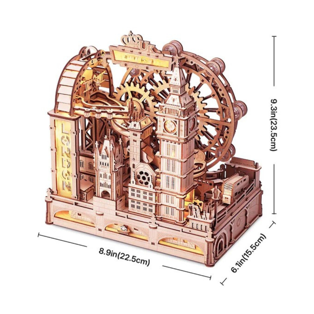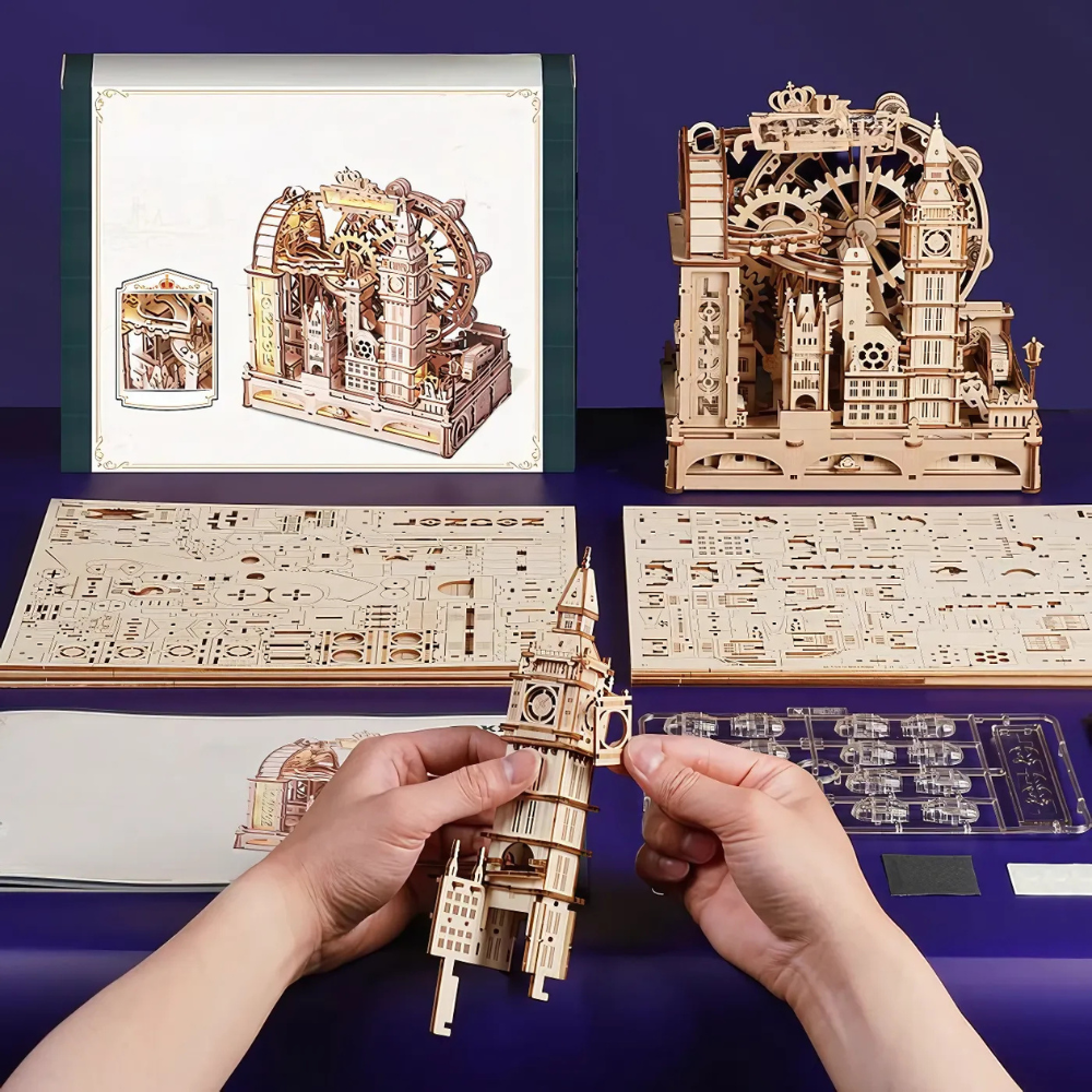 The London Marble Run Puzzle brings landmarks and mechanical design together in a wooden 3D DIY model. It merges entertainment, education, and aesthetics in a single project.