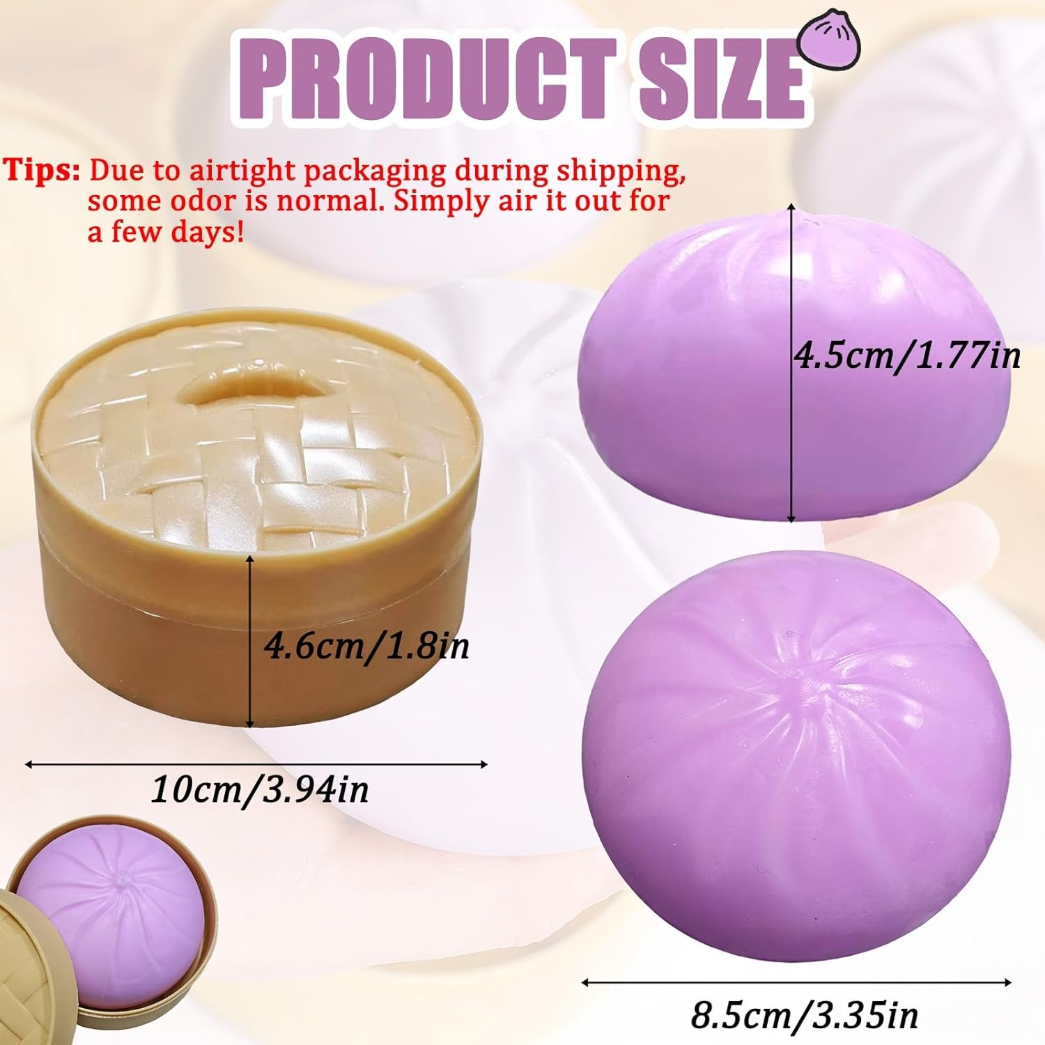 This Desk Display Squishy includes a fitted storage container that keeps the product organized. The round box matches the dumpling theme and allows upright placement.