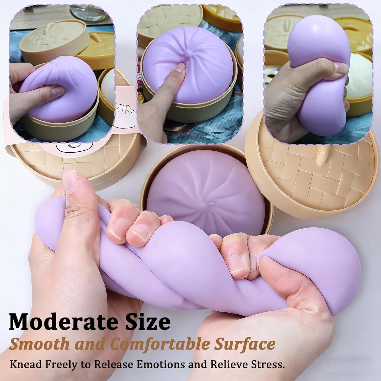 The Oversized Dumpling Squishy Decompression Fidget Toy With Storage Box combines visual appeal with tactile engagement in one compact set. Designed in a rounded dumpling form, it includes a matching round storage container inspired by bamboo steamers. This set is created for those who enjoy squeeze-based items that return to shape gradually after compression.