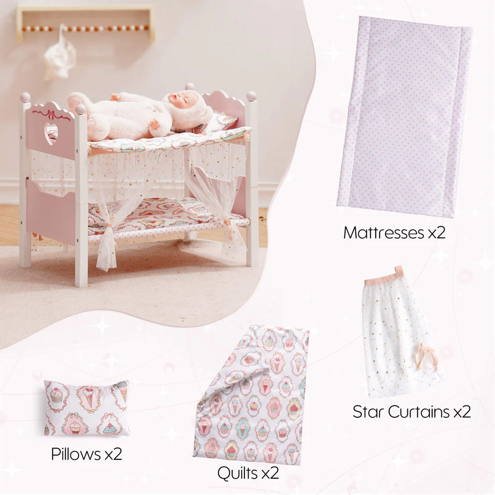 - 2-in-1 Design: A realistic miniature bunk bed that can hold multiple dolls under 20 inches.