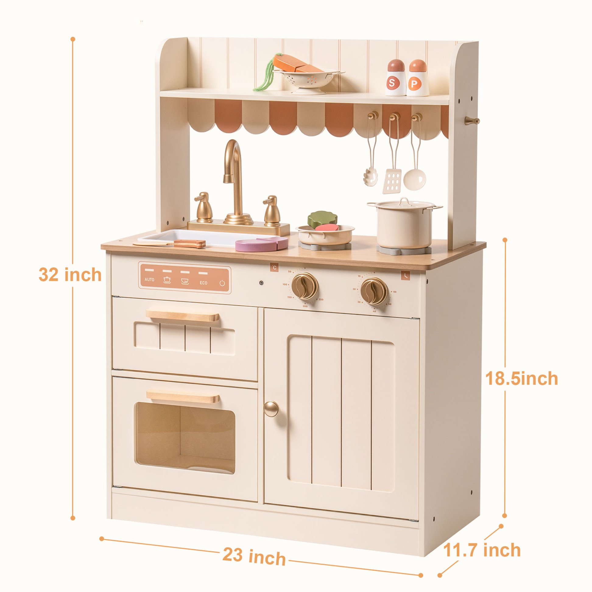 This Wooden toy kitchen with sink stands out with its vintage caramel finish and golden accents. Children gain an immersive play experience with realistic features like a working faucet, oven, and storage. Parents advantage its Montessori-inspired design, which fosters responsibility and creativity. Compact and elegant, it serves as both a toy and a decorative element in the home.