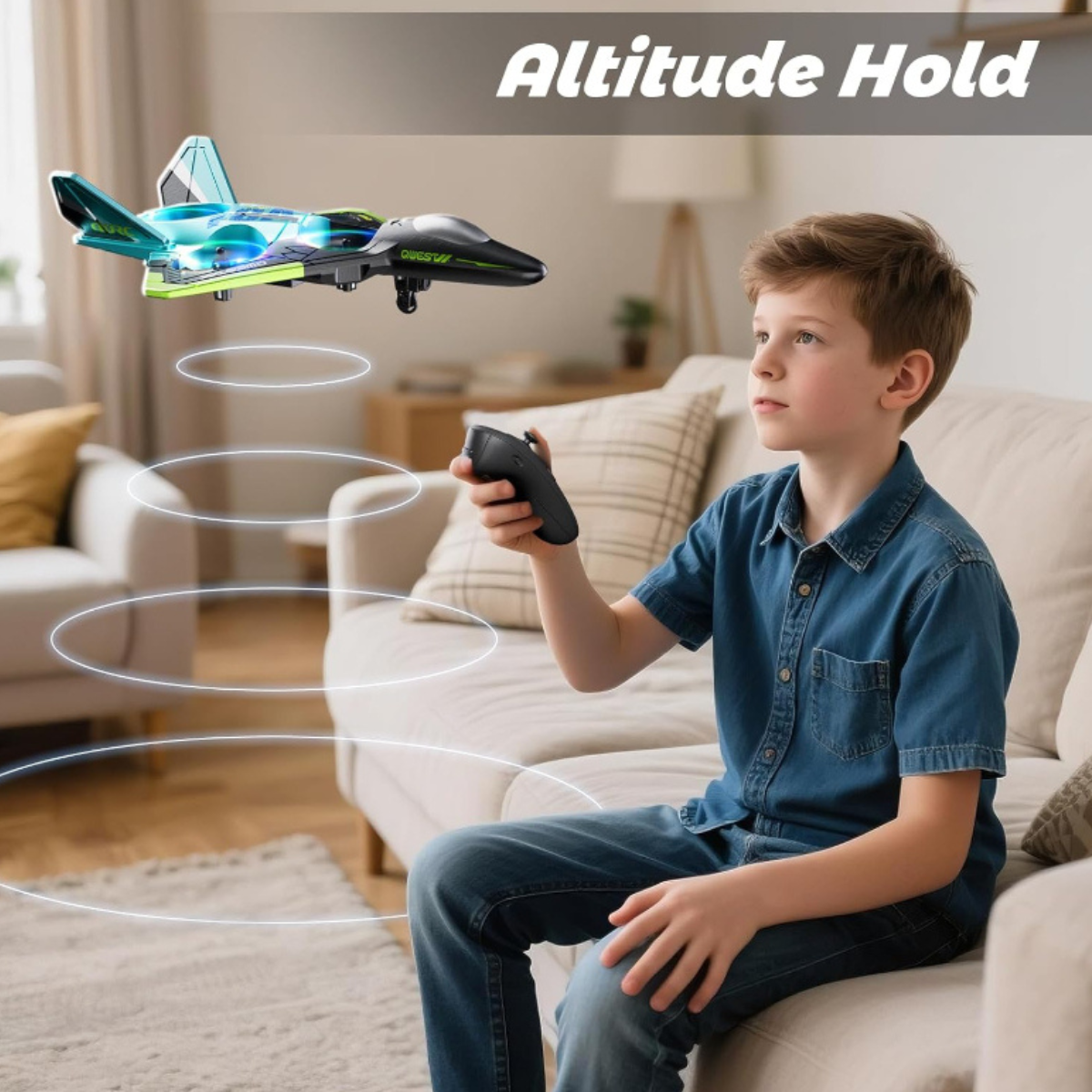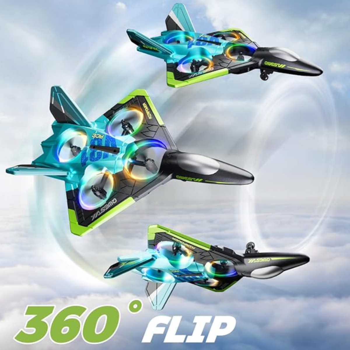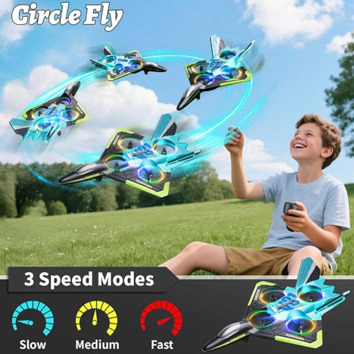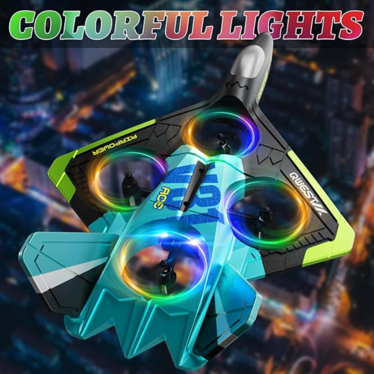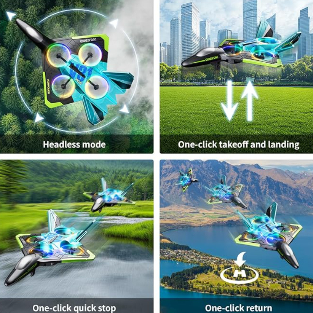 The airplane features a streamlined fighter-style design that supports smooth airflow. Four enclosed propellers help maintain balance during flight. Built-in LED lights allow easy tracking during low light conditions. The glowing light effect improves visibility during evening use. Headless mode supports easier direction control, while speed modes allow gradual skill progression.