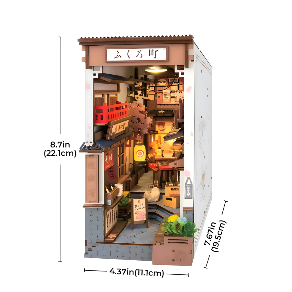 The Sakura Alley Kit offers a balance of craftsmanship and artistry in a compact format. Designed for decorative purposes, it combines miniature detail, layered textures, and LED accents to transform your bookshelf into a more engaging display.