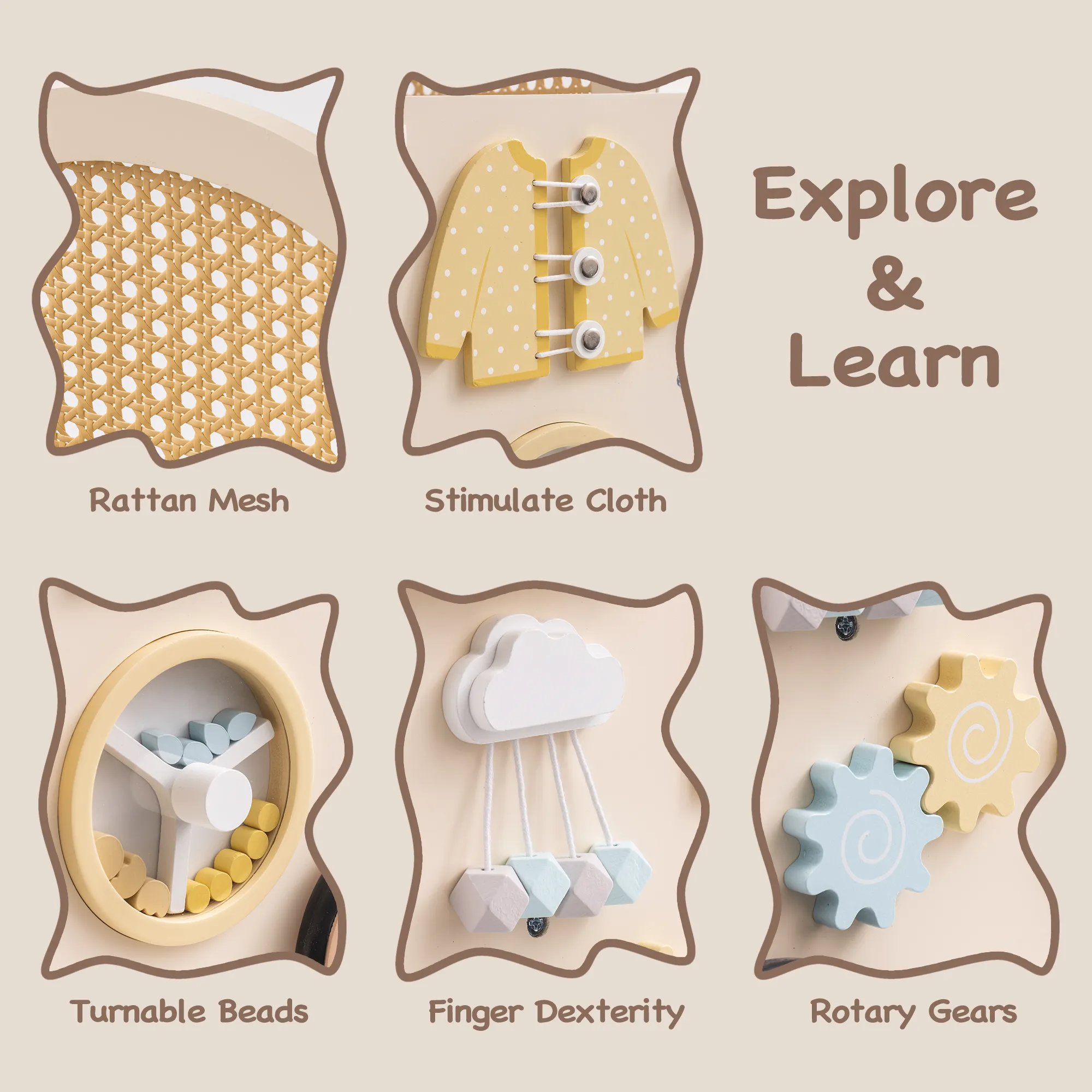 - Activity Center: Includes zippers, buttons, rolling beads, and pretend washing machine play.