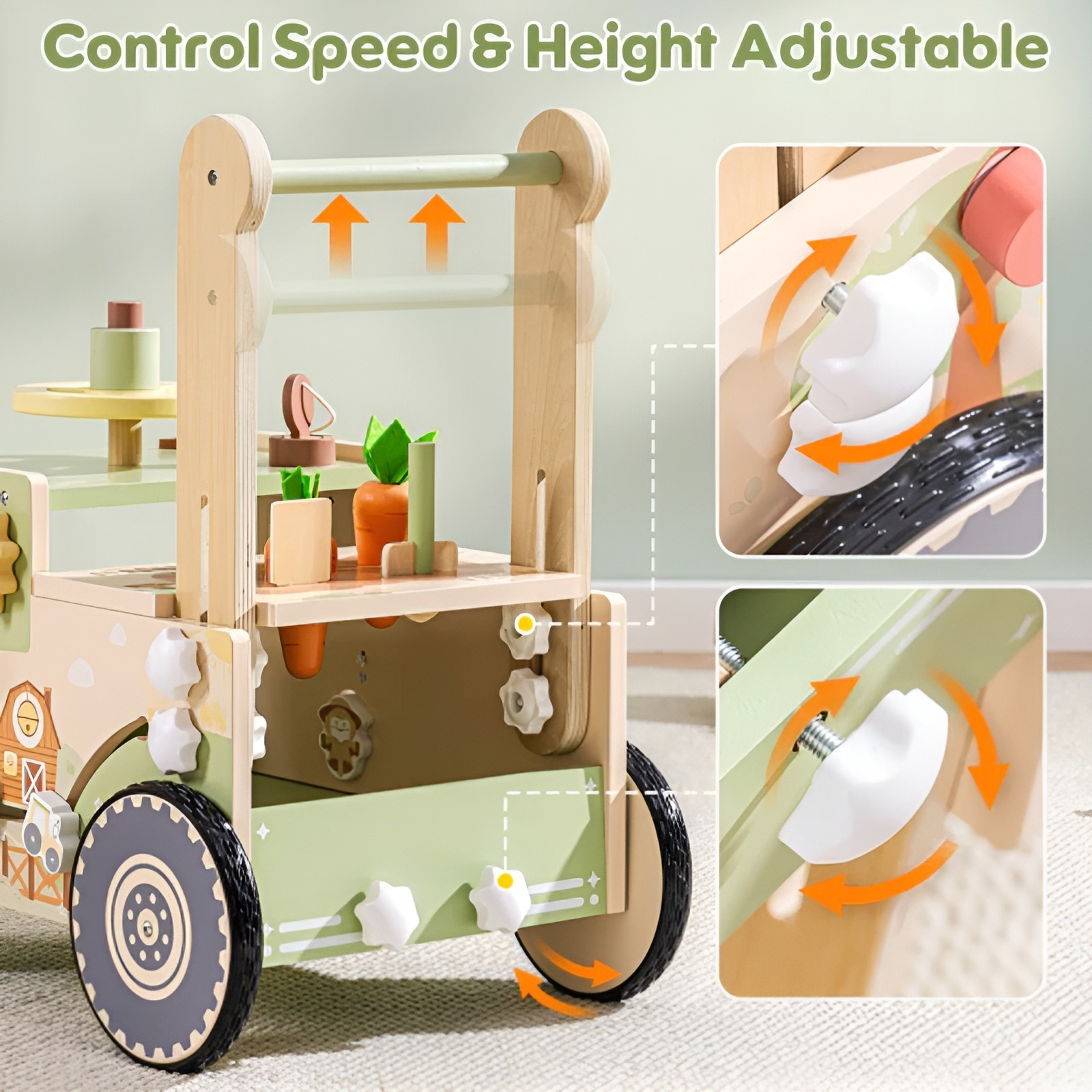 With sturdy wooden construction, smooth edges, and rounded corners, the walker ensures safety while being strong enough to handle daily play. Designed for children aged 10 months and above, it grows with toddlers as they explore, walk, and engage in farm-inspired activities.