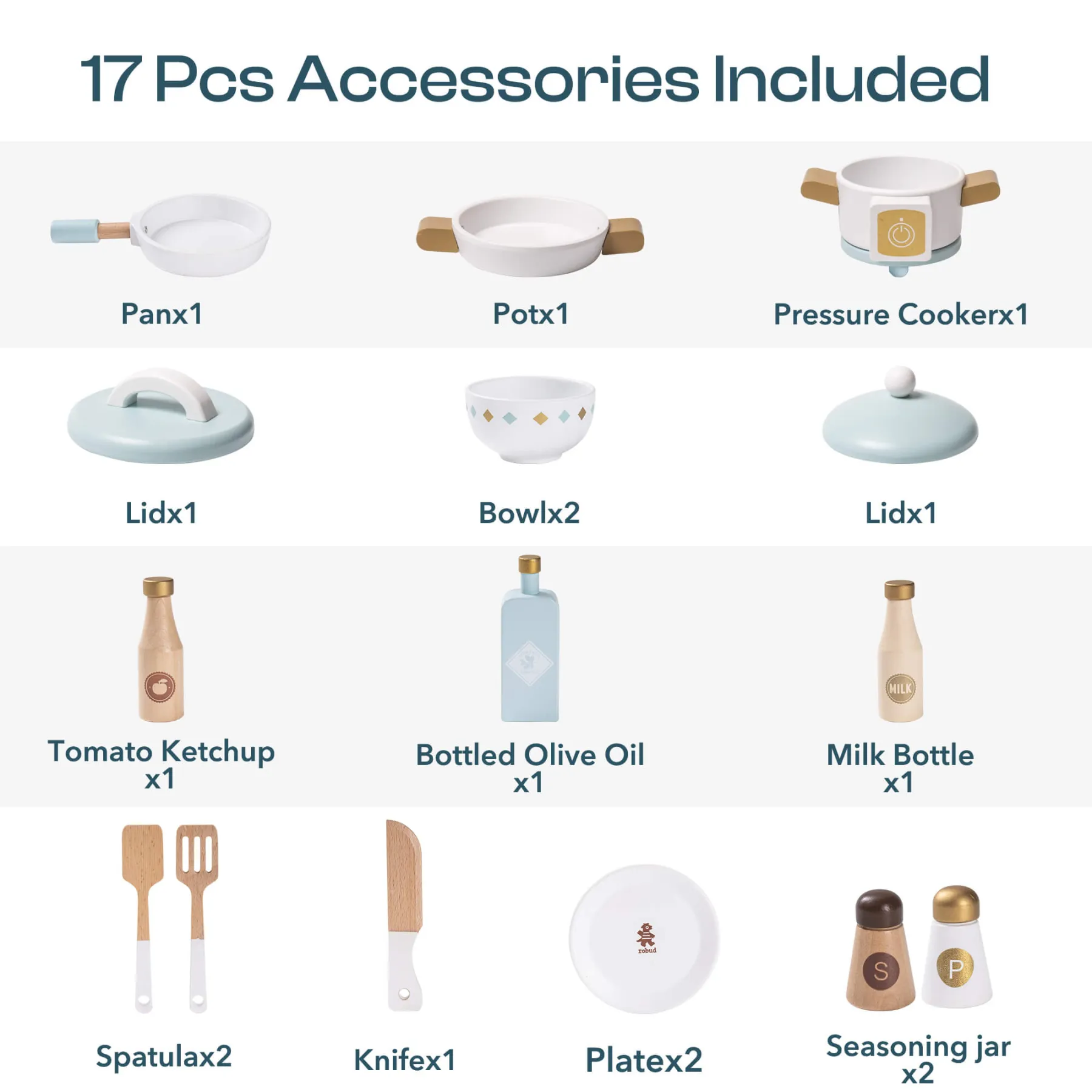 - Accessories: Bowls, saucers, pot, pan, scoop, spoon, and clock.