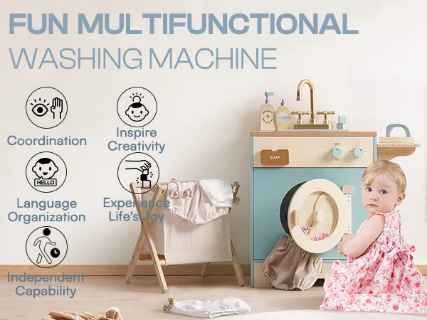 The setup features a realistic washer panel with rotating beads inside a transparent circle, allowing children to simulate the tumbling motion of laundry. Each movement helps spark imagination while reinforcing routine behaviors in a hands-on environment.