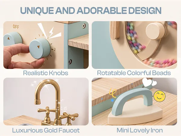 Its structured form stands firmly on most flat surfaces and supports multi-angle access. Kids can use the washing machine setup at the front and move around to the side to interact with the ironing elements.