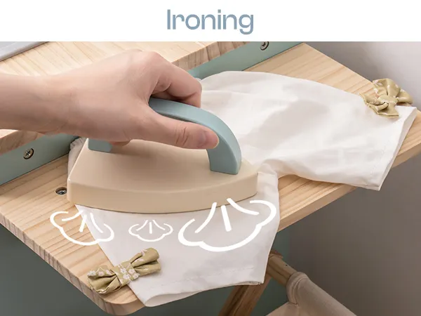 A wooden ironing board connects to the side of the setup and features an iron that can rest flat when not in use. These components allow for multi-step role play, where children move from washing to pressing and then to sorting or storing.