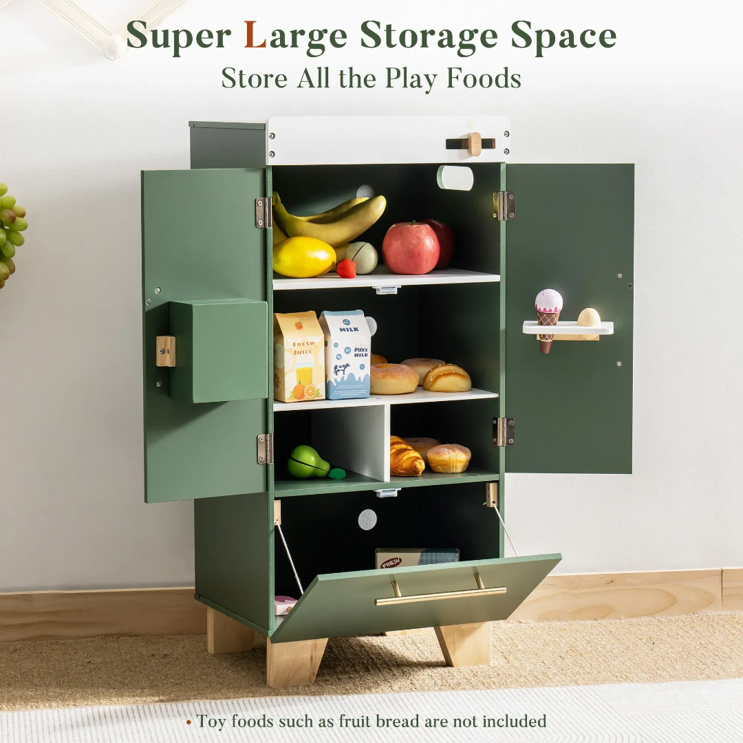 The Wooden Toy Refrigerator Unit adds a visually pleasing and practical element to children's play. With functional doors, accessible compartments, and a muted green finish, it supports role-play while doubling as a decorative toy.
